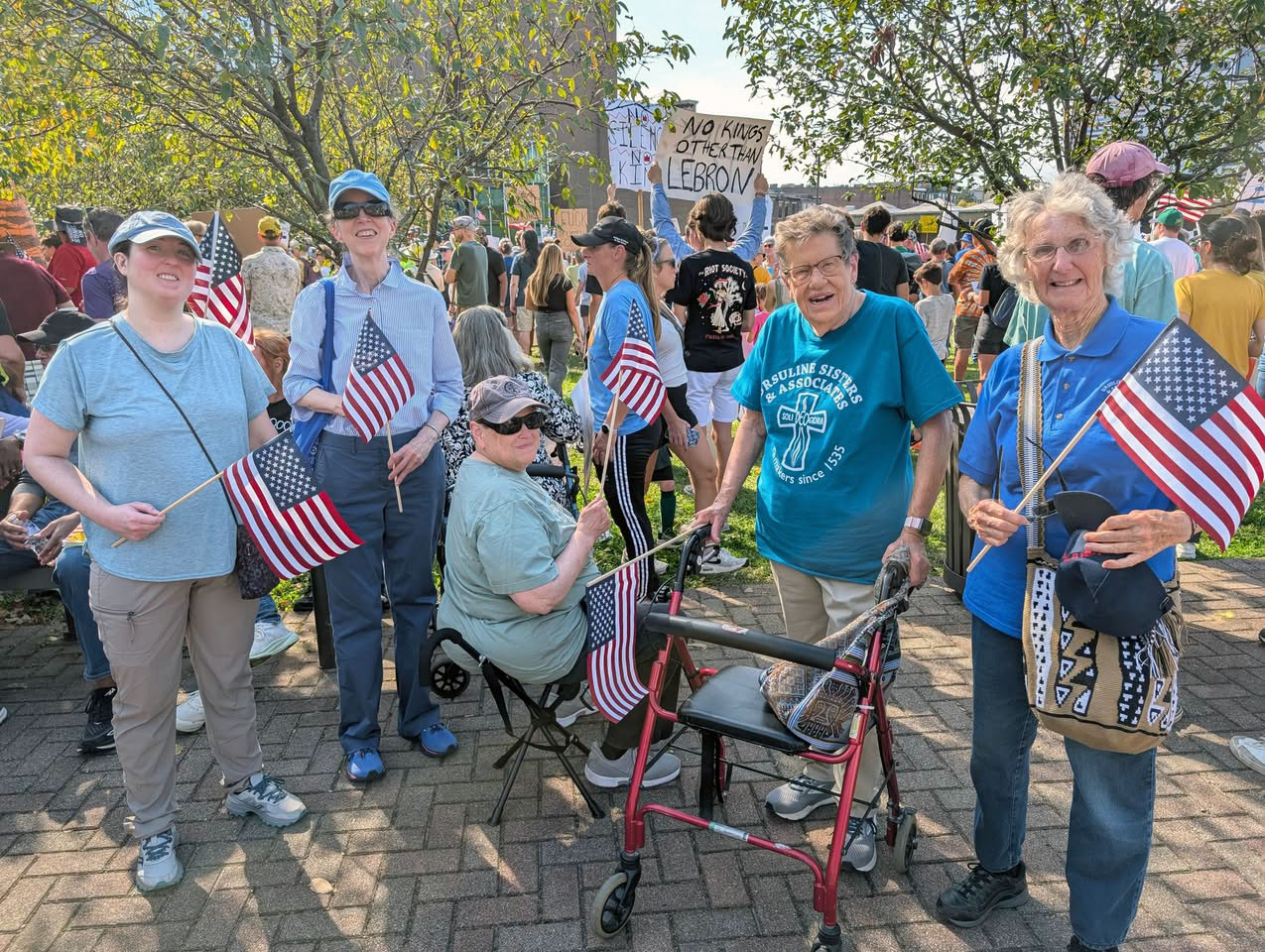 Several of our Ursulines participated in the October 18 “No Kings” March in downtown Louisville, and neighboring St. Matthews. The march drew thousands in Louisville. We wanted to show support for the marginalized and all those suffering under the current administration.